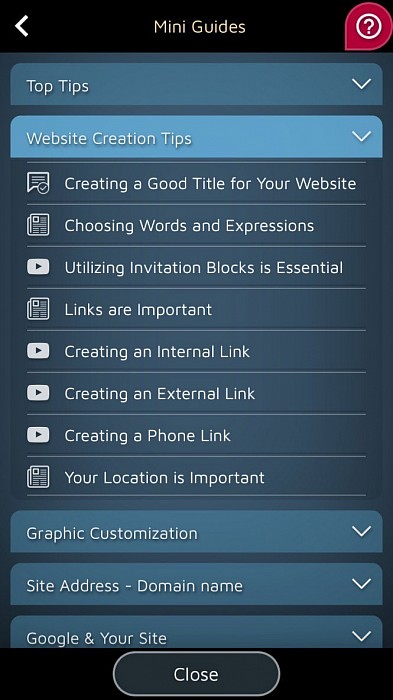 నాణ్యమైన సైట్ను సృష్టించడంలో మీకు మరింత సహాయపడటానికి, మీరు అనేక విలువైన సూచనలు మరియు చిట్కాలను కలిగి ఉన్న మినీ-గైడ్స్ మెనూను చూడవచ్చు. మీకు అదనపు ఫీచర్లు అవసరమైనప్పుడు మాత్రమే సైట్ను Smart లేదా Pro సైట్గా అప్గ్రేడ్ చేయండి.